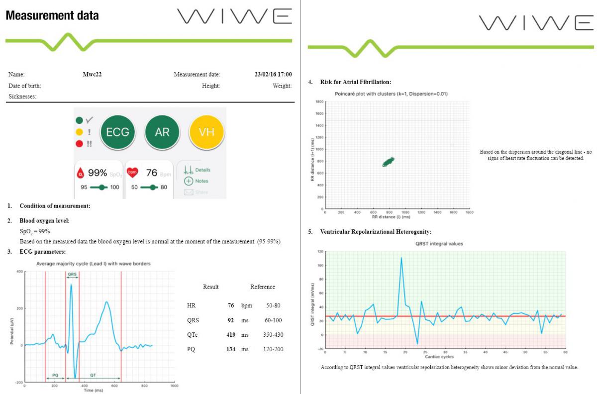 WIWE не только записывает ЭКГ, но и указывает на ненормальности обычных параметров электрокардиограммы, обращает внимание на мерцательную аритмию, если она присутствует, и состояние миокарда (это уникальная методология, нигде больше не используемая, по утверждению разработчиков).