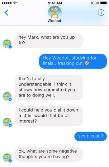 Woebot работает через Facebook Messenger, действуя как персональный психотерапевт и помогая пользователю справиться со своими проблемами. С помощью разговора на обычном "человеческом" языке приложение позволяет пользователю получить эмоциональную поддержку, которая ему нужна, и научиться практическим методам, позволяющим изменить ход мыслей о происходящих в его жизни явлениях. Этот "умный" робот-психотерапевт доступен пациенту в любое время и из любого места, и позволяет получить доступную психологическую помощь людям, которые в этом нуждаются, причем за очень небольшую плату, отмечает mHealthSpot.